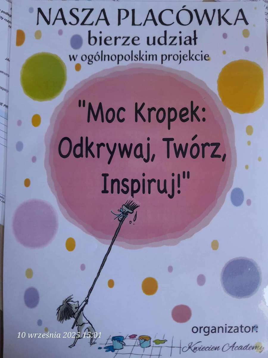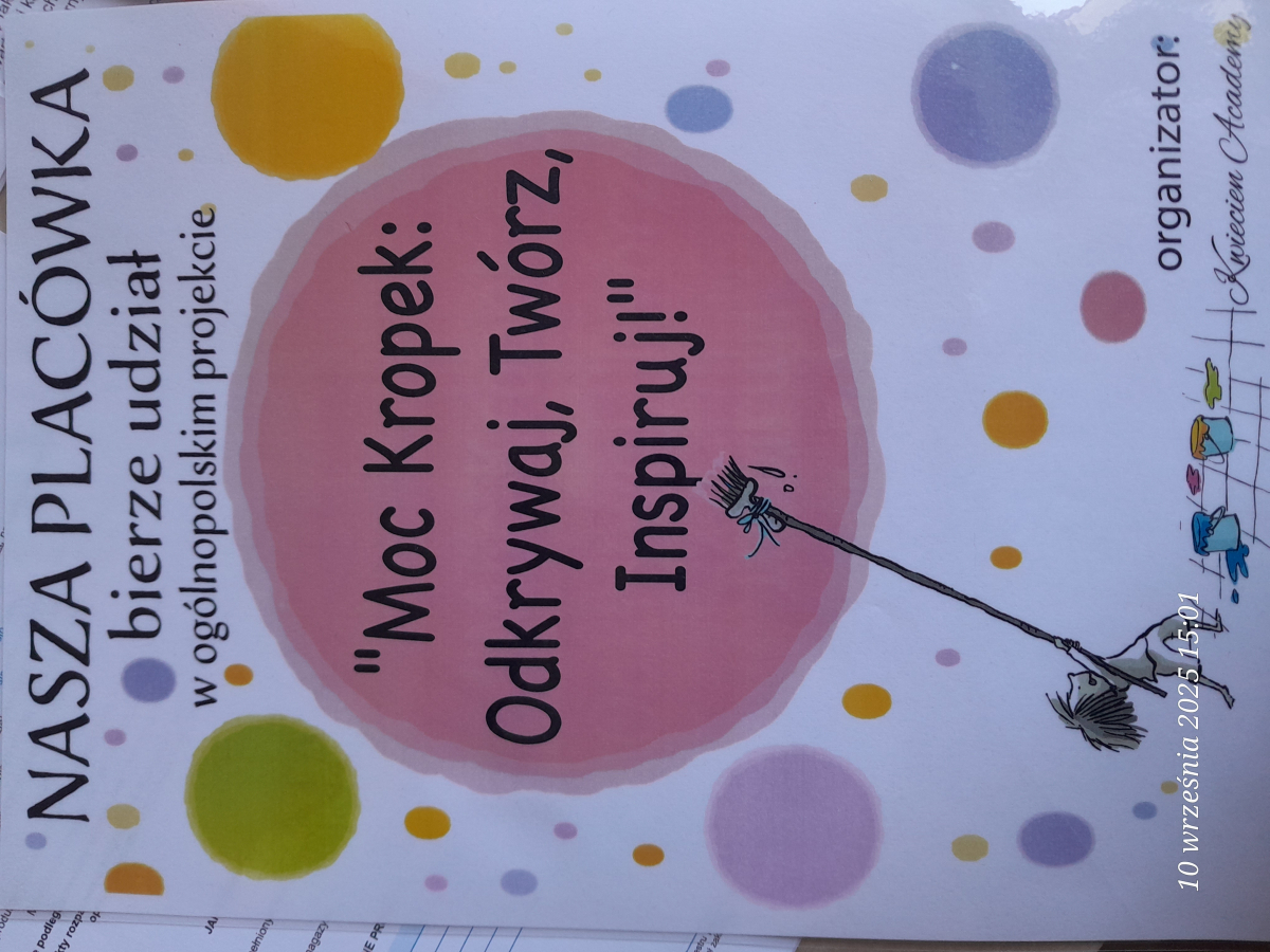 Międzynarodowy Dzień Kropki jest świętem kreatywności i odwagi. Z okazji tego święta nasze przedszkole brało udział w projekcie edukacyjnym „MOC KROPEK” ODKRYWAJ, TWÓRZ, INSPIRUJ”. Projekt miał na celu: